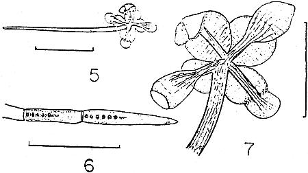 FIGURES 5-7. Echeneibothrium bilobatum n. sp. 5. Entire worm of E. bilobatum. 6. End proglottids of E. bilobatum. 7. Head of E. bilobatum.