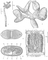 FIGURES 1-5. Rhinebothrium chilensis n. sp. 1. Allure generale du scolex. 2. Scolex d’apres une preparation in toto. 3. Disposition schematique des locules dans une bothridie. 4. Anatomie d’un segment, vue ventrale. 5. Coupe transversale su niveau de la poche du cirre.