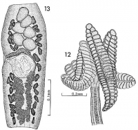 FIGURES 12 & 13. Rhinebothrium lintoni n. sp. 12. Scolex. 13. Mature segment.