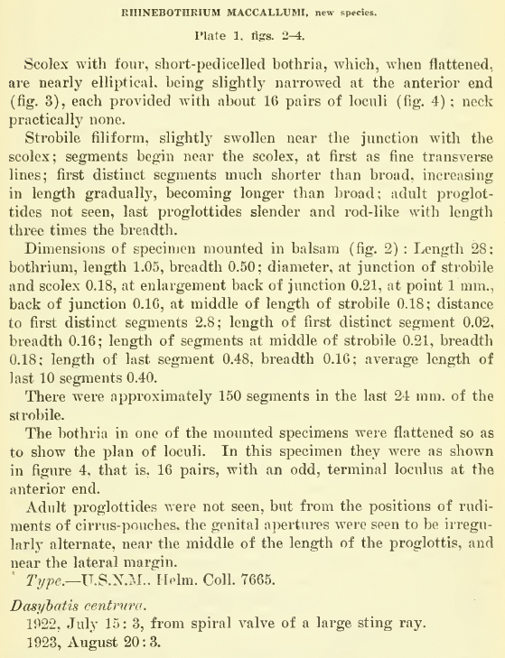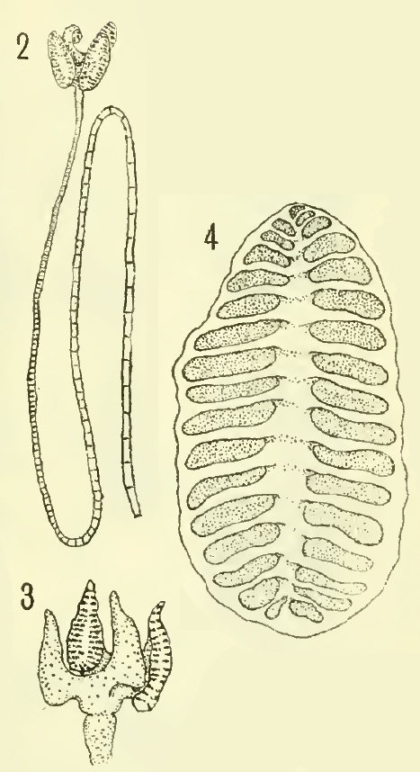 PLATE 1. FIGURES 2-4. Rhinebothrium maccallumi n. sp., from Dasybatis centrura. 2. Free-hand sketch of specimen mounted in balsam; length about 28 mm. 3. Free-hand sketch of another scolex, compressed; diameter of scolex 1.47. 4. Camera lucida sketch of bothrium, showing arrangement of loculi; length 0.45mm.