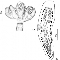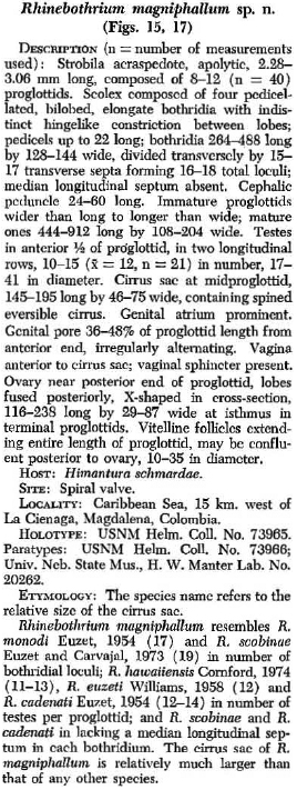 FIGURES 15 & 17. Rhinebothrium magniphallum n. sp. 15. Scolex. 17. Mature proglottid.