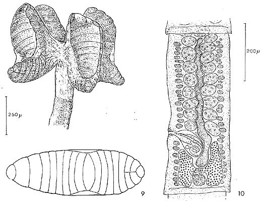 FIGURES 8-10. Rhinebothrium scobinae n. sp. 8. Scolex d’apres un montage in toto. 9. Schema de la disposition des locules dans une bothridie. 10. Anatomie d’un segment,vue ventrale.