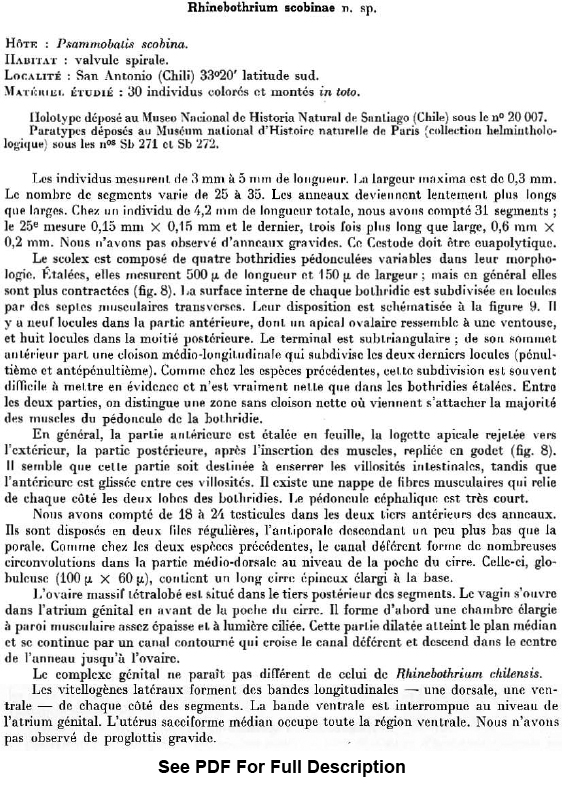 Euzet, L. and J. Carvajal-Garay. 1973. Rhinebothrium (Cestoda, Tetraphyllidea) parasites de raies du genre Psammobatis au Chili. Bulletin du Muséum National d´Histoire Naturelle, 3e Série Zoologie 101: 779-787. (193) Download PDF |