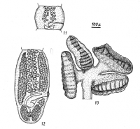 Redescribed in Williams, 1958. Figs. 10-12. Rhinebothrium trygonis (Shipley and Hornell, 1906). 10. Scolex. 11. Immature segment. 12. Adult segment.