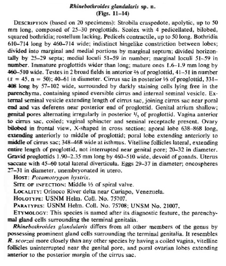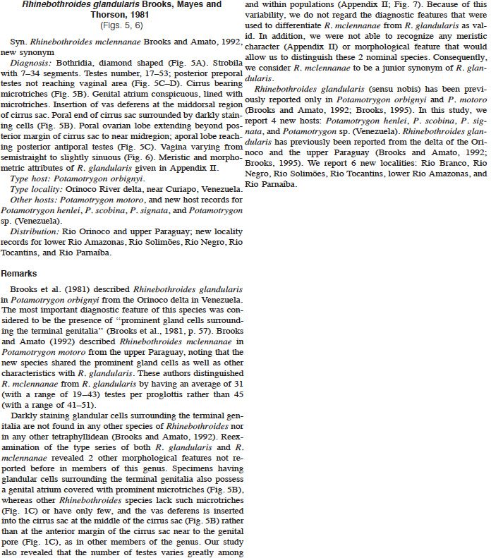 Marques, F. P. L. and Brooks, D. R.. 2003. Taxonomic Revision of Rhinebothroides (Eucestoda: Tetraphyllidea: Phyllobothriidae), Parasites of Neotropical Freshwater Stingrays (Rajiformes: Myliobatoidei: Potamotrygonidae). Journal of Parasitology 89(5): 994-1017. (6622) Download PDF |