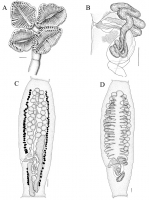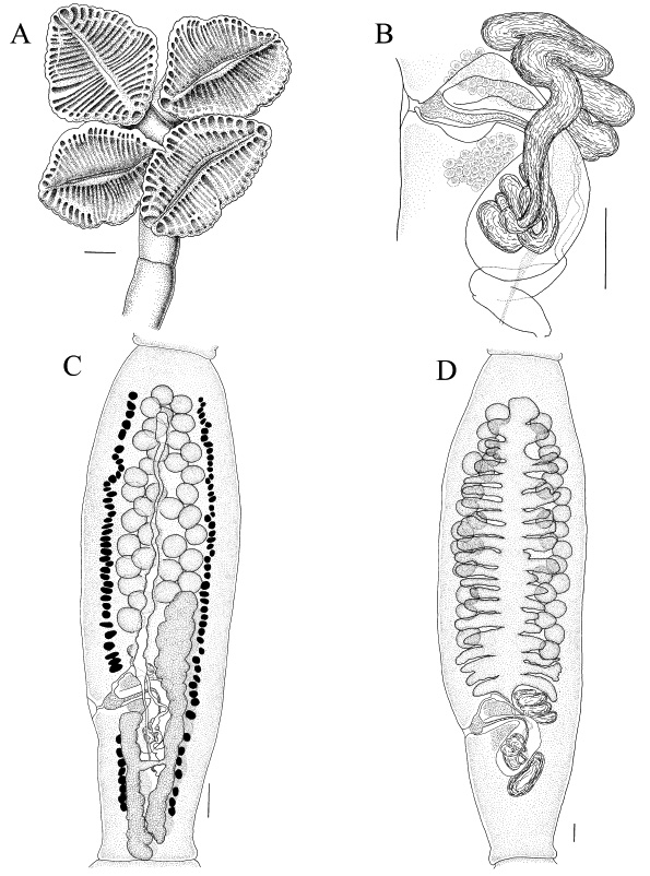 Figure 5. Rhinebothroides glandularis. A. Scolex (HWML 21007). B. Cirrus sac region. C. Mature proglottis (HWML 21007). D. Postgravid proglotts (HWML 21007). Bars = 100µm.