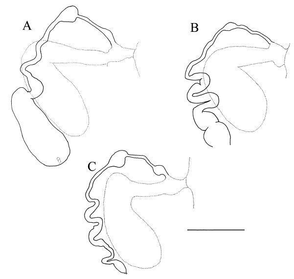 Figure 6. Vaginal morphology. A. R. glandularis (HWML 21007). B-C. R. glandularis (USNPC 75708). Bar = 100µm.