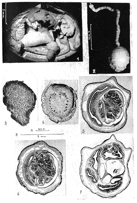 FIG. 1: Le parasite en position dans la Maetre; FIG. 2: Le parasite isolé; FIG. 3: Coupe transversale de la trompe dans la règion de l'épanouissement discoïdal, noter le développement du tissu musculaire; FIG. 4: Coupe transversale dans la région moyenne de la trompe; FIG. 5, 6, 7: Coupes transversales dans la capsule; FIG. 5: Aspect de la masse viscérale (M. V.) trilobèe; FIG. 6: Région d'attache de la masse viscèrale sur le bouclier (Bo); FIG. 7: Coupe dans la règion postérieure de la capsule et intéressant uniquement le bouclier parcouru par son canal sinueux. A: grossissement des figures 3 et 4; B: grossissement des figures 5, 6, 7; Bo.: bouclier; Br.: branchie; M. : manteau; M. ad.: muscle adducteru; M.v.: masse viscérale; P.: palpe.