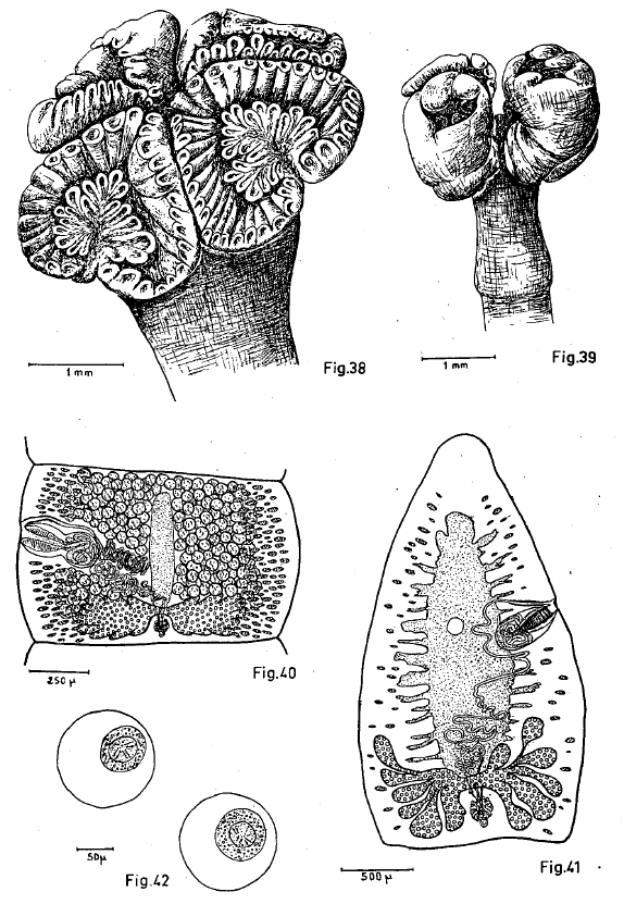FIGURES 38-42. Spaerobothrium lubeti n. sp. 38. Scolex a bothridies etalees. 39. Scolex a bothridies contractees. 40. Segment sexue. 41. Proglottis. 42. Oeufs embryonnes.