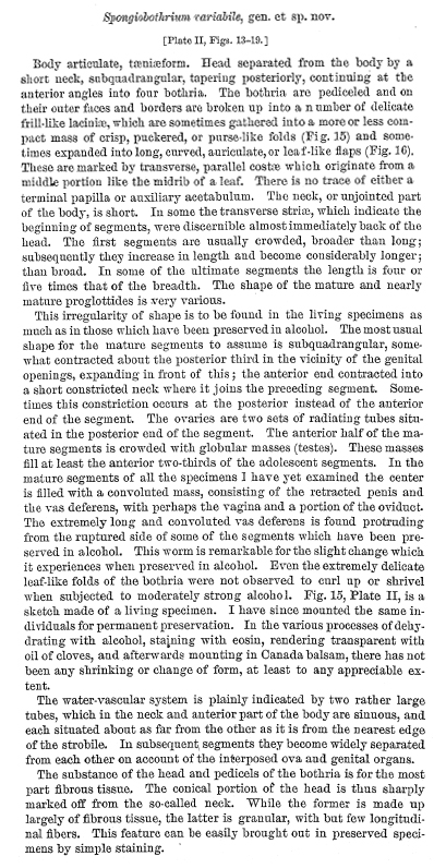 PLATE II. FIGURES 13-19. Spongiobothrium variabile n. sp. 13. Outline of strobile with regular slender segments, enlarged 5 diameters. 14. Outline of another specimen with shorter and more irregular segments, enlarged 6 diameters. 15. Side view of head, neck, and anterior segments, edges of bothria contracted, enlarged 10 diameters. 16. Front view of head of another specimen, with two bothria expanded, enlarged 10 diameters. 17. Three mature segments, enlarged 5 diameters. 18. Median segment, enlarged 20 diameters. 19. Mature segment, enlarged 20 diameters.