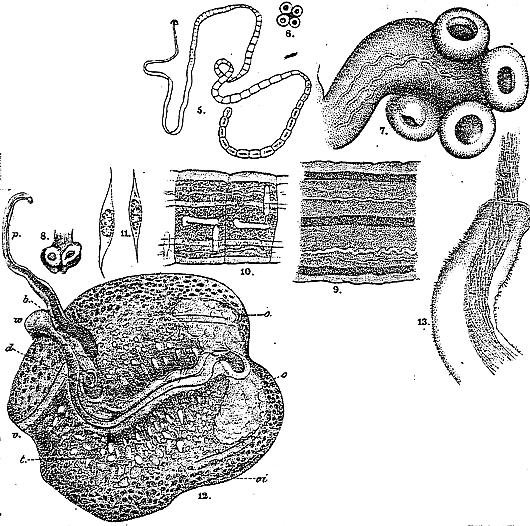 FIGURE 5-13. Tetrabothrium maculatum n. sp. 5. Vermis magnitudine naturali. 6. Caput a facie visum. 7. Caput inter laminas vitreus situm. 8. Caput fere a latere visum, motu incepto. 9. Colli pars; vasa longitudinalia conspicua. 10. Articuli duo anteriores, vasa longit. et rudimenta apparatus generationis proebentes. 11. Ovula. 12. Proglottis matura. 13. Penis pars, fila spermatica fovens.