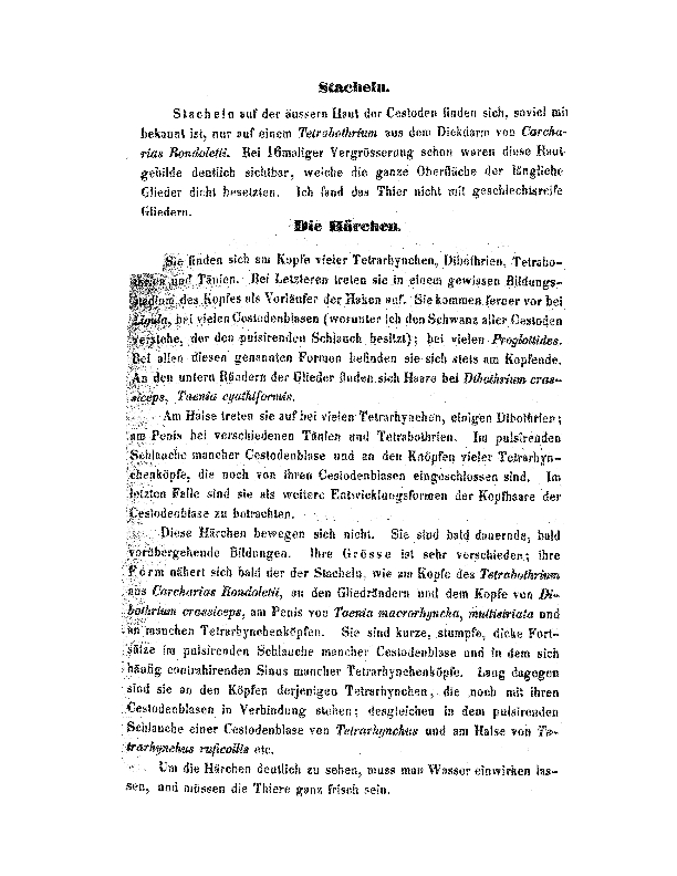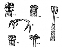 FIGURES 266-271. Tetrabothrium carchariae rondoletii n. sp. 266. Verschiedene formen eines Tetrabothrium aus dem dickdarme von Carcharias rondoletii. Kopf von oben. Der leib ist ganz mit stacheln besetzt, der kopf mit kurzen, starren haaren. 16 mal. 267. Eine andere kopfform desselben thieres, ebenso vergrössert. 268. Andere kopfform desselben thieres. 269. Dasselbe thier mit verlängerten grubenstielen und langem halse. Alle diese konnten gruben und hals bedeutend verlängern. 270. Das thier in ganzer grösse. Die gliederbildung hatte hier schon angefangen. Ich konnte jedoch keine geschlechtstheile und keinen pulsirenden schlauch wahrnehmen. 271. Haken oberhalb einer grube. Sie sind hohl. Der grosse nach aussen stehende haken hat einen fortsatz. An ihn geht ein muskel, von einer kleinen flügelförmigen verbreitung der sauggruben herkommend. 260mal.