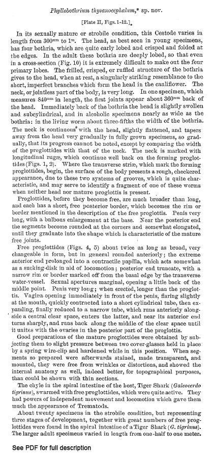 | Scientific Name Notes | Linton included ONLY a description of a species he referred to as "Thysanocephalum crispum Lt." (pg. 823) after the diagnosis of "Thysanocephalum, gen. nov.". He included "Phyllobothrium thysanocephalum Lt." in smaller letters below the heading for T. crispum. However, to our knowledge this is the first use of the name "crispum" and it appears he used it for Phyllobothrium thysanocephalum. Which would be an incorrect replacement name. Thysanocephalum crispum is thus a Nomen nudum. |