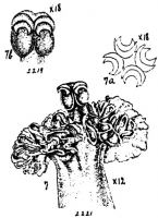 FIGURE 7. Phyllobothrium crispum n. sp. 7. Head and neck of young (sic) specimen, enlarged 12 diameters. A. Front view of rostellum, enlarged 18 diameters. B. Side view of same, enlarged 18 diameters.