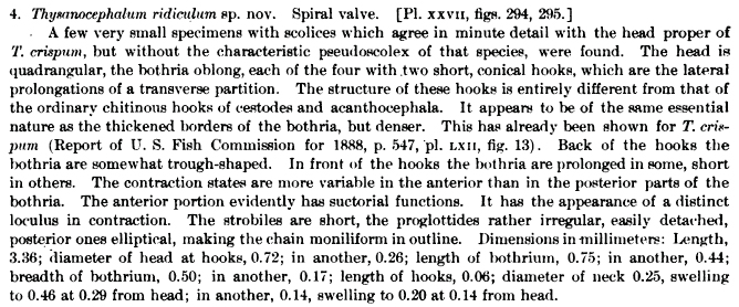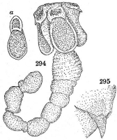 FIGURES 294 & 295. Thysanocephalum ridiculum n. sp. 294. Strobile. a. Bothrium frrom another specimen. 295. Hook and adjacent part of bothrium.