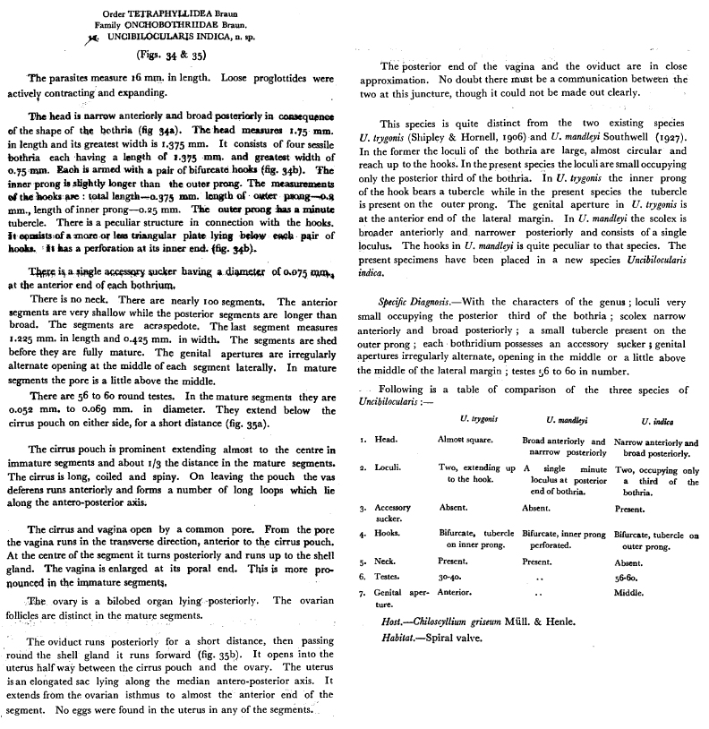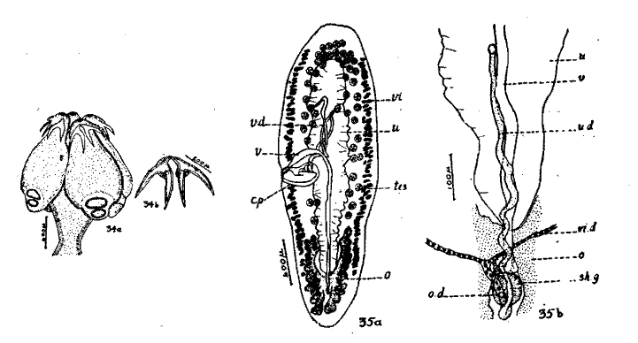 FIGURES 34 & 35. Uncibilocularis indica n. sp. 34.a. Scolex. b. hooks showing th granular plate. 35.a. A loose segment. b. Region of the ovary showing the oviduct, etc. Abbreviations: c.p., cirrus pouch; o., ovary; o.d., oviduct; sh.g., shell gland; tes., testes; u., uterus; v., vagina; v.d., vas deferens; vi., vitellaria; vi.d., vitelline duct; u.d., uterine duct.