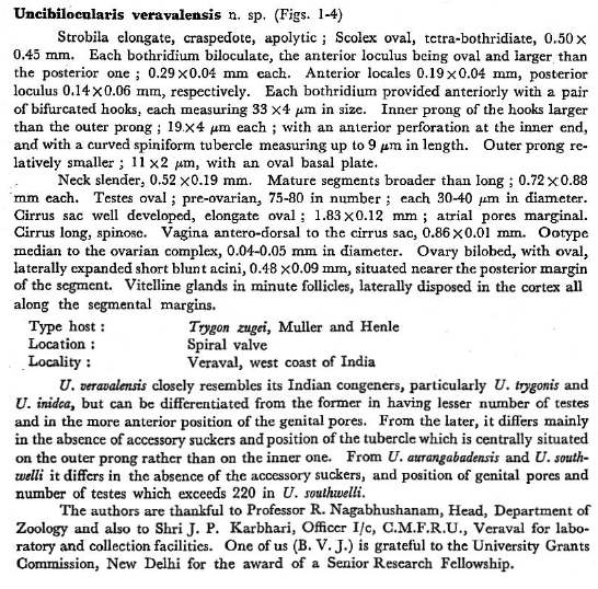 Jadhav, B. V. and G. B. Shinde. 1981. Uncibilocularis veravalensis n. sp. (Cestoda: Onchobothriidae) from an Indian marine fish. Indian Journal of Parasitology 5: 113-115.