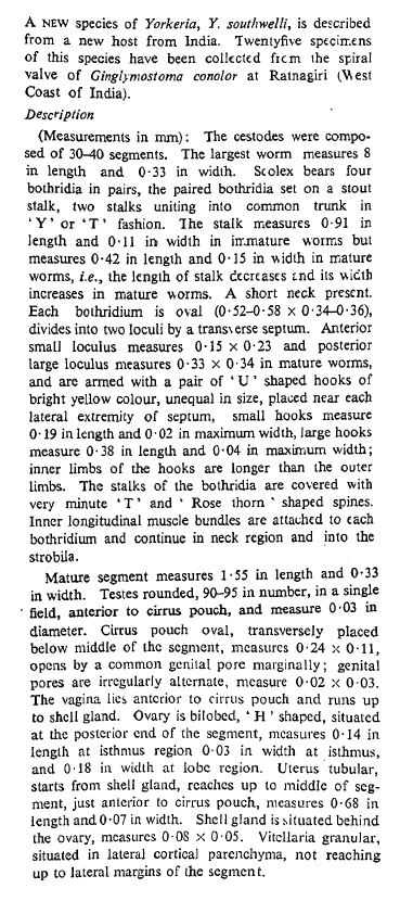 Deshmukh, R. A. 1979. On a new cestode Yorkeria southwelli (Cestoda: Onchobothriidae) from a marine fish. Current Science 48: 271-272. (162) Download PDF |