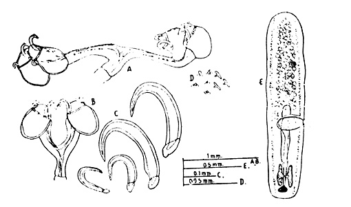 FIGURE 1. Yorkeria southwelli n. sp. A. Scolex of immature worm. B. Scolex of mature worm. C. Bothridial hoosk. D.’T ‘and ‘Rose thorn’ shaped hooks of scolex. E. Mature segment.