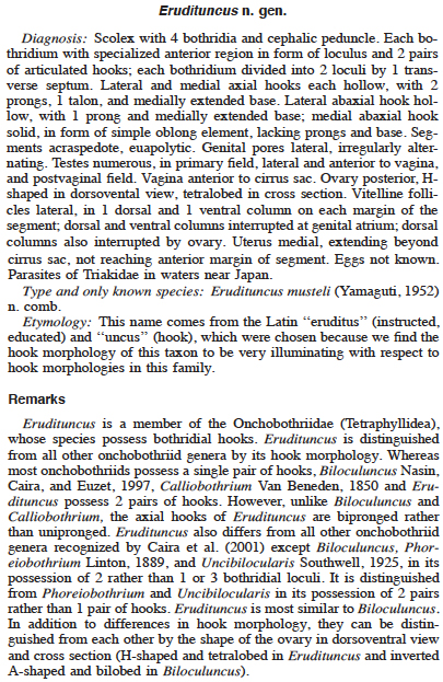 | Type Species | Erudituncus musteli (Yamaguti, 1952) Healy, Scholz & Caira, 2001 |