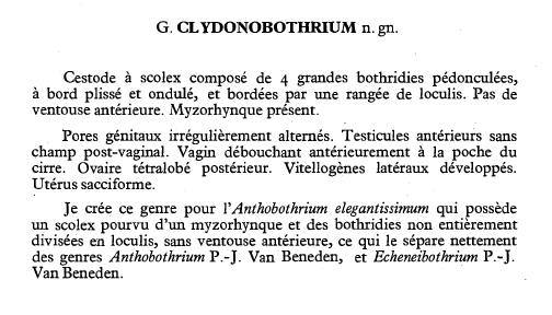 | Type Species | Clydonobothrium elegantissimum (Lönnberg, 1889) Euzet, 1959 |