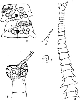 Tatria iunii sp. n.: d=strobila; e-scolex; f-rostellar hook; g-hermaproditic proglottis; h-cirrus hooks.