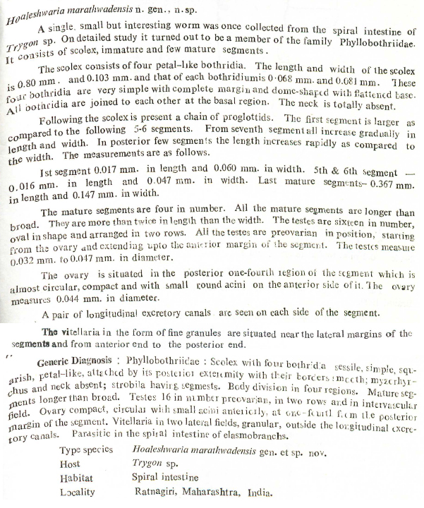 Shinde, G. B. and L. N. Chincholikar. 1975. On Hoaleshwaria marathwadensis (Cestoda; Phyllobothriidae Braun, 1900) n. gen., n. sp. from marine fish at Ratnagiri, India. Marathwada University Journal of Science 14(Sci. 7): 359-361.