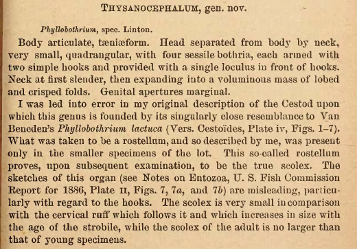 | Scientific Name Notes | Linton included ONLY a description of a species he referred to as "Thysanocephalum crispum Lt." (pg. 823) after the diagnosis of "Thysanocephalum, gen. nov.". He included "Phyllobothrium thysanocephalum Lt." in smaller letters below the heading for T. crispum. |