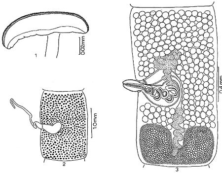 FIGURES 1-3. Cathetocephalus australis n. sp. 1. Scolex. 2. Mature proglottid. 3. Gravid proglottid, showing distribution of vitelline follicles. The cirrus is about one-half extended.