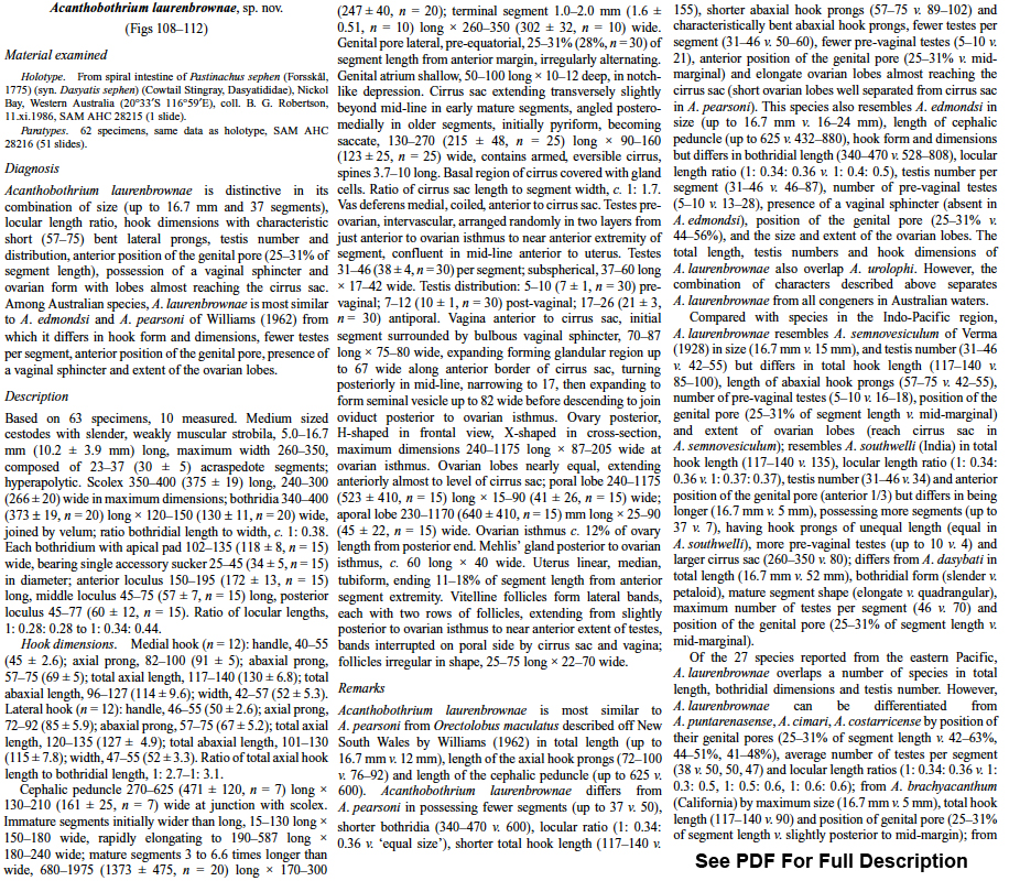 Campbell, R. A. and I. Beveridge. 2002. The genus Acanthobothrium (Cestoda: Tetraphyllidea: Onchobothriidae) parasitic in Australian elasmobranch fishes. Invertebrate Systematics 16: 237-344. (3867) Download PDF |