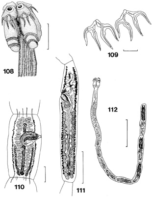 Figs 108–112. Acanthobothrium laurenbrownae, sp. nov.: 108, scolex; 109, hooks; 110, mature segment; 111, subterminal segment; 112, entire worm. Scale bars: Figs 108, 112, 1.0 mm; Fig. 109, 0.05 mm; Fig. 110, 0.1 mm; Fig. 111, 0.5 mm.
