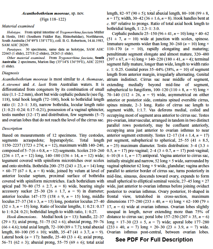 Campbell, R. A. and I. Beveridge. 2002. The genus Acanthobothrium (Cestoda: Tetraphyllidea: Onchobothriidae) parasitic in Australian elasmobranch fishes. Invertebrate Systematics 16: 237-344. (3867) Download PDF |