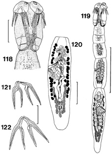 Figs 118–122. Acanthobothrium mooreae, sp. nov.: 118, scolex; 119, entire worm; 120, terminal segment; 121, 122, hooks. Scale bars: Fig. 118, 0.1 mm; Fig. 119, 0.5 mm; Fig. 120, 0.2 mm; Figs 121, 122, 0.05 mm.