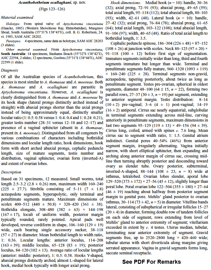 Campbell, R. A. and I. Beveridge. 2002. The genus Acanthobothrium (Cestoda: Tetraphyllidea: Onchobothriidae) parasitic in Australian elasmobranch fishes. Invertebrate Systematics 16: 237-344. (3867) Download PDF |