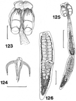 Figs 123–126. Acanthobothrium ocallaghani, sp. nov.: 123, scolex; 124, hooks; 125, entire worm; 126, terminal segment. Scale bars: Figs 123, 126, 0.2 mm; Fig. 124, 0.1 mm; Fig. 125, 0.5 mm.
