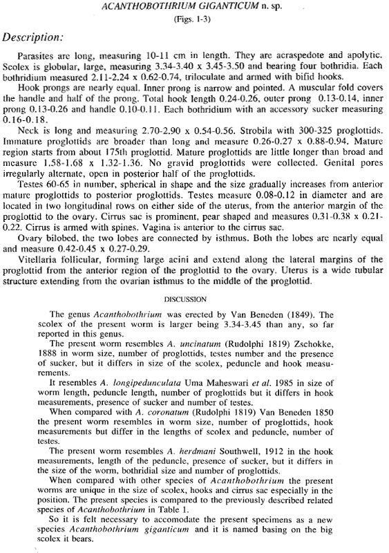 Sanaka, S., C. Vijaya Lakshmi, and K. Hanumantha Rao. 1993. Description of a new species of Acanthobothrium giganticum from Gymnura micrura from Waltair coast. Rivista di Parassitologia 10: 371-374. (3868) Download PDF |