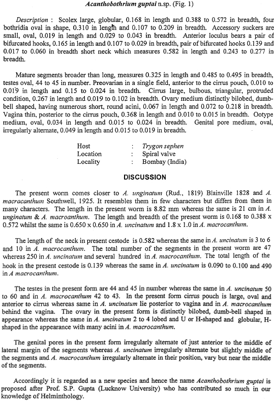 Shinde, G. B. and H. K. Bhagwan. 2002. Acanthobothrium guptai n. sp. (Cestoda: Onchobothridae) [sic] from Tyrgon [sic] sephen. Uttar Pradesh Journal of Zoology 22: 207-209.