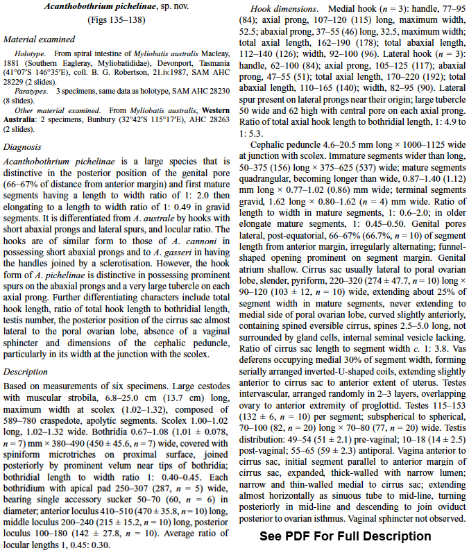 Campbell, R. A. and I. Beveridge. 2002. The genus Acanthobothrium (Cestoda: Tetraphyllidea: Onchobothriidae) parasitic in Australian elasmobranch fishes. Invertebrate Systematics 16: 237-344. (3867) Download PDF |