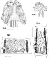 Figs 135–138. Acanthobothrium pichelinae, sp. nov.: 135, scolex; 136, hooks; 137, mature