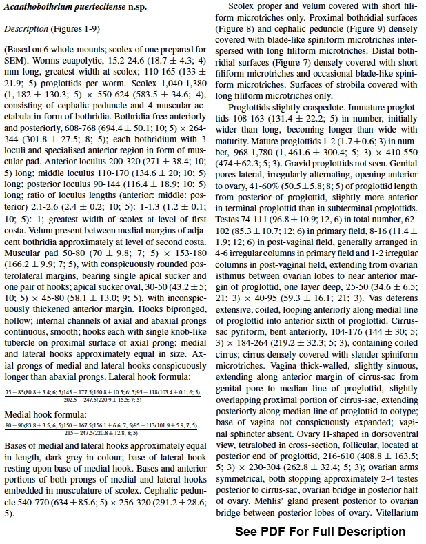 Caira, J. N. and S. Zahner. 2001. Two new species of Acanthobothrium Beneden, 1849 (Tetraphyllidea: Onchobothriidae) from horn sharks in the Gulf of California, Mexico. Systematic Parasitology 50: 219-229. (3874) Download PDF |