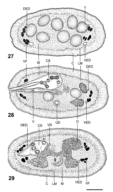 From Ivanov & Campbell, 2002. FIGURES 27-29. Notomegarhynchus shetlandicum n. comb. 27. Cross section of mature segment at level of testes anterior to cirrus sac. 28. Cross section of mature segment a... MoreFrom Ivanov & Campbell, 2002. FIGURES 27-29. Notomegarhynchus shetlandicum n. comb. 27. Cross section of mature segment at level of testes anterior to cirrus sac. 28. Cross section of mature segment at level of cirrus sac. 29. Cross section of mature segment at level of ovarian isthmus. Scale bar = 200µm. Abbreviations: C, cortex; CS, cirrus sac; DED, dorsal excretory duct; LM, longitudinal musculature; M, medulla; O, ovary; T, testis; V, vagina; VED, ventral excretory duct; VF, vitelline follicles; UD, uteroduct. |