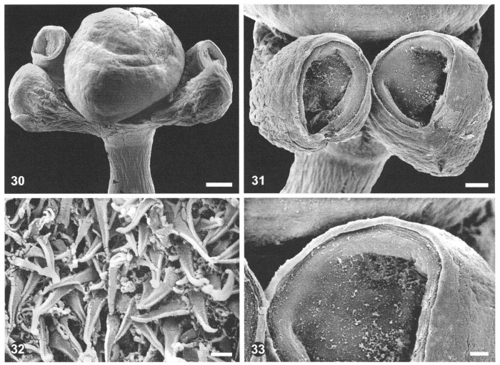 From Ivanov & Campbell, 2002. FIGURES 30-33. Scanning electron micrographs of Notomegarhynchus shetlandicum n. comb. 30. Scolex, scale bar = 120µm. 31. Detail of acetabula, scale bar = 100µm. 32. stal... MoreFrom Ivanov & Campbell, 2002. FIGURES 30-33. Scanning electron micrographs of Notomegarhynchus shetlandicum n. comb. 30. Scolex, scale bar = 120µm. 31. Detail of acetabula, scale bar = 100µm. 32. stalk surface showing spiniform microtriches, scale bar = 1µm. 33. Detail of anterior margin of acetabulum, note absence of pit, scale bar = 50µm. |
