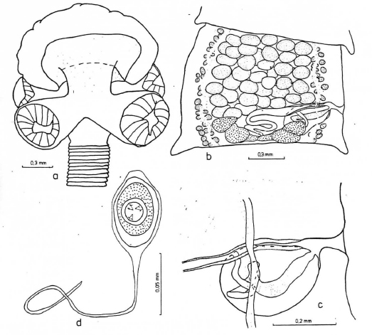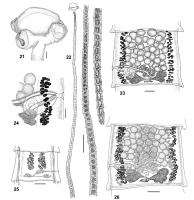 From Ivanov & Campbell, 2002. FIGURES 21-26. Notomegarhynchus shetlandicum n. comb. 21. Scolex, scale bar = 100µm. 22. Complete worm, scale bar = 3mm. 23. Mature segment, scale bar = 200µm. 24. Detail... MoreFrom Ivanov & Campbell, 2002. FIGURES 21-26. Notomegarhynchus shetlandicum n. comb. 21. Scolex, scale bar = 100µm. 22. Complete worm, scale bar = 3mm. 23. Mature segment, scale bar = 200µm. 24. Detail of terminal genitalia, scale bar = 100µm. 25. Immature segment, scale bar = 200µm. 26. Gravid segment, scale bar = 200µm. |