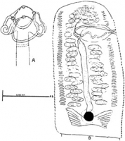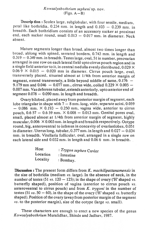 Kowsalyabothrium sepheni sp. nov. Fig. A. Scolex, B. Mature segment.