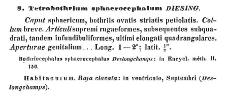 | Synonyms | Bothriocephalus sphaerocephalus Deslongchamps, 1824, Echeneibothrium sphaerocephalum (Deslongchamps, 1824) Diesing, 1863 |