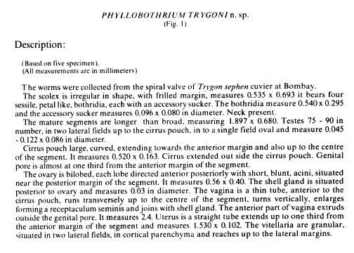 Jadhav, B. V. 1985. Phyllobothrium trygoni n.sp. (Cestoda: Phyllobothriidae) from Trygon sephen. Rivista di Parassitologia 46: 181-183.