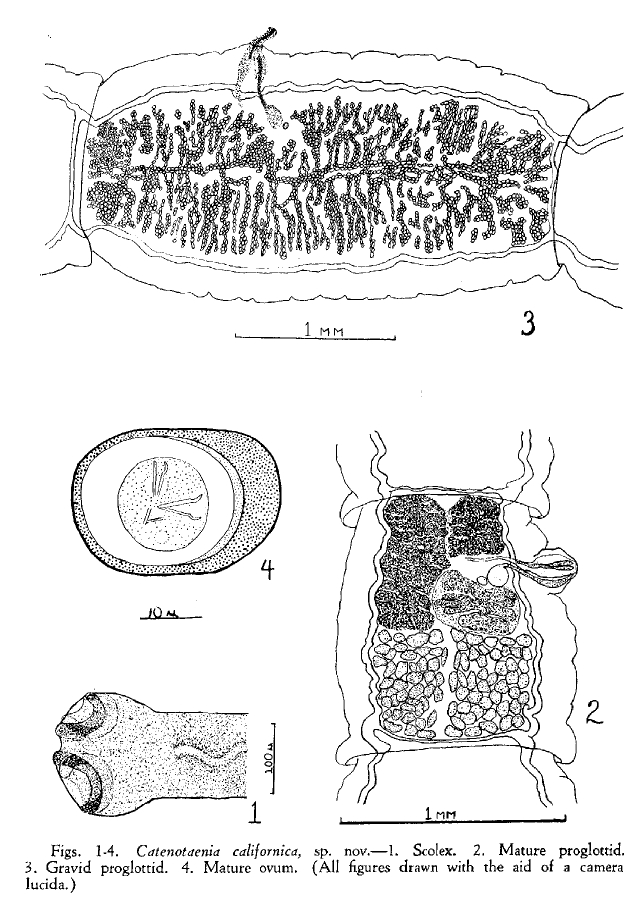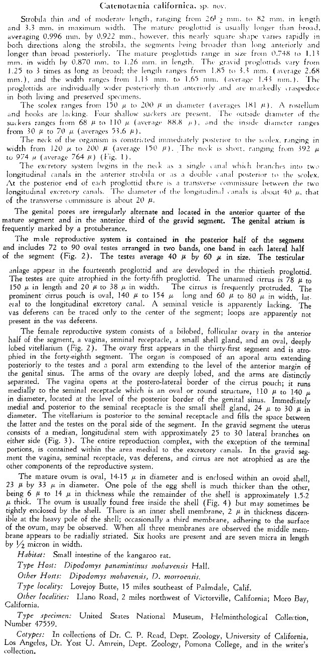 Dowell, A. M. 1953. Catenotaenia californica, sp. nov., a cestode of the kangaroo rat, Dipodomys panamintinus mohavensis. American Midland Naturalist 49: 738-742.