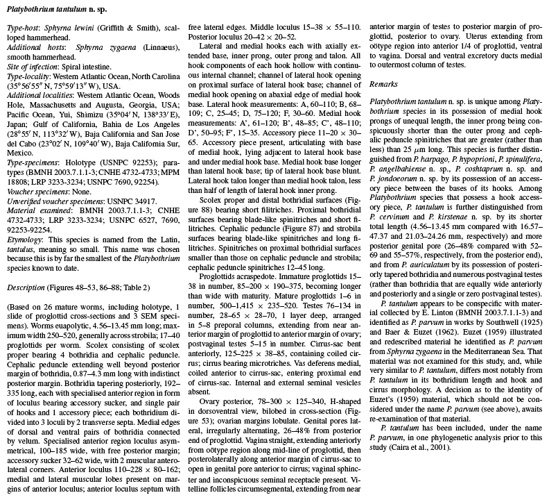 Healy, C. J. 2003. A revision of Platybothrium Linton, 1890 (Tetraphyllidea: Onchobothriidae), with a phylogenetic analysis and comments on host-parasite assocations. Systematic Parasitology 56: 85-139. (3894) Download PDF |