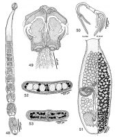 mature proglottid at level of testes. 53. Cross-section of mature proglottid at level of ovary.