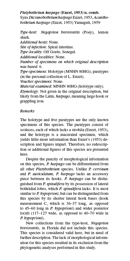 Euzet, L. 1953. Dicranobothrium, un nouveau genre de cestode tétraphyllide, parasite de sélaciens. Bulletin de la Société Neuchâteloise des Sciences Naturelles. 3e Série 76: 87-91. (184) Download PDFHealy, C. J. 2003. A revision of Platybothrium Linton, 1890 (Tetraphyllidea: Onchobothriidae), with a phylogenetic analysis and comments on host-parasite assocations. Systematic Parasitology 56: 85-139. (3894) Download PDF |